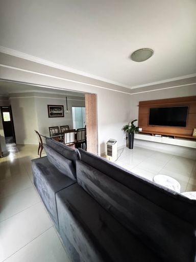 Casa sendo sala, cozinha grande com churrasqueira, ilha, pia com cuba dupla, três quartos sendo um suíte, e duas semi suíte, lavanderia coberta, lavabo, garagem para três veículos, porta da sala e janelas em alumínio, piso porcelanato, um amplo quintal nos fundos. Bem localizado próximo a supermercados, áreas verdes.