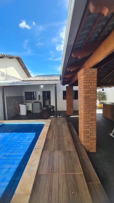 Linda casa sendo sala ampla, dois quartos sendo um suíte com box e espelho, banheiro social com box, cozinha bem grande com armários planejados embaixo da pia, lavanderia coberta, varanda gourmet com churrasqueira, banheiro na parte externa com chuveiro, um quarto na parte externa, que pode também ser um escritório. Piscina aquecida. Sistema de energia fotovoltaica.