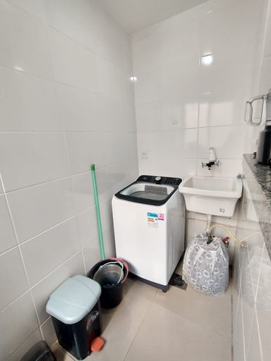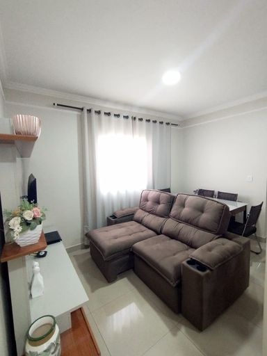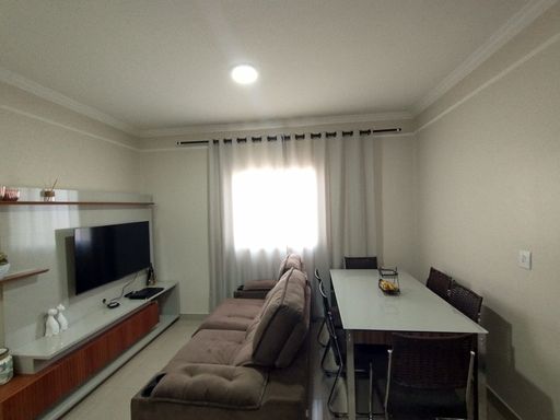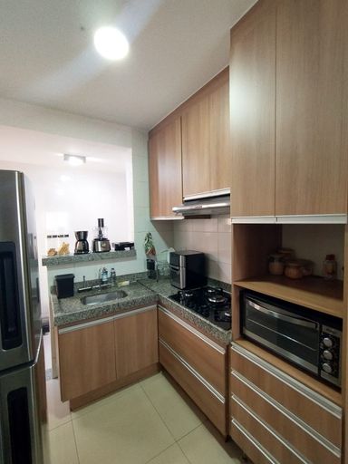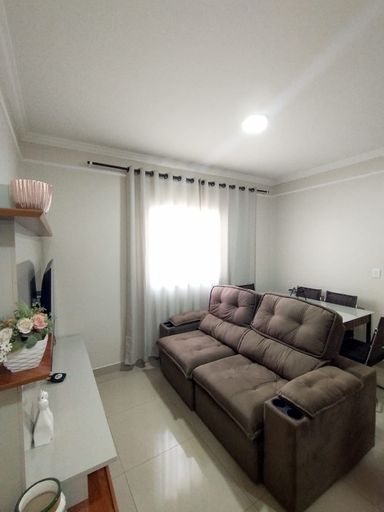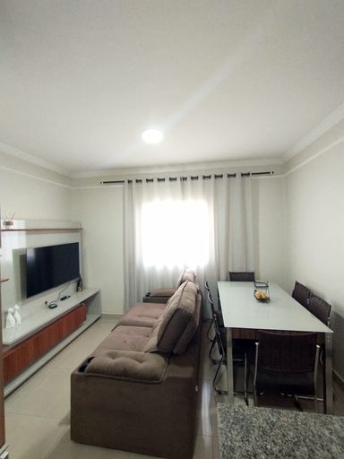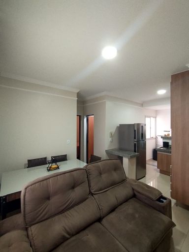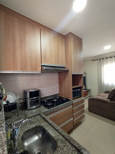 Lindo apartamento sendo sala, cozinha estilo americana, toda planejada com armários, fogão cooktop, suggar, dois quartos sendo um com guarda roupa planejado, banheiro social com box, armário e espelho. Lavanderia e uma vaga de garagem coberta.