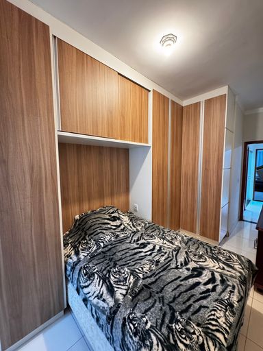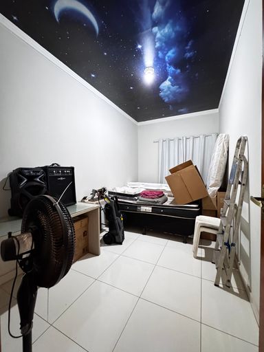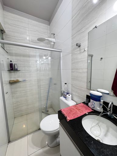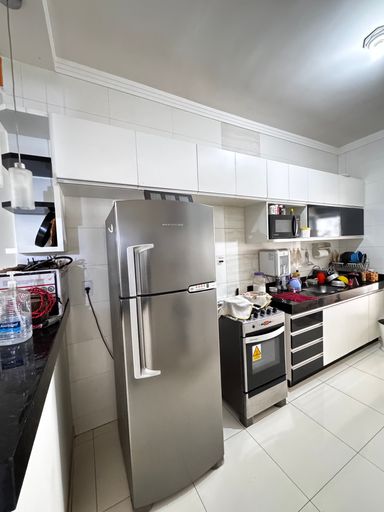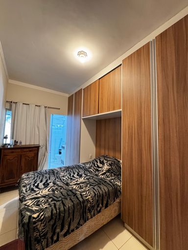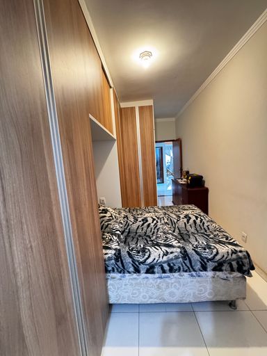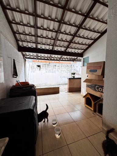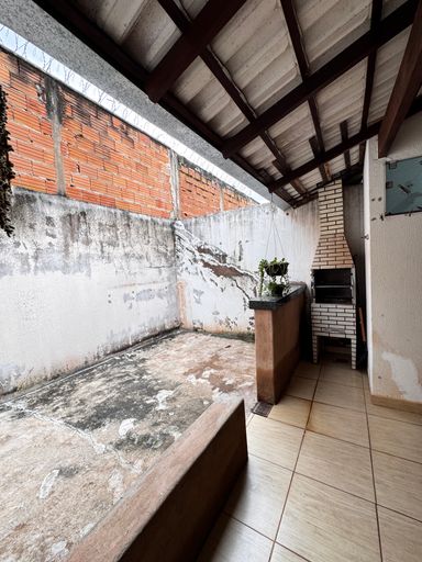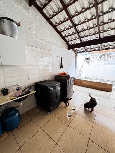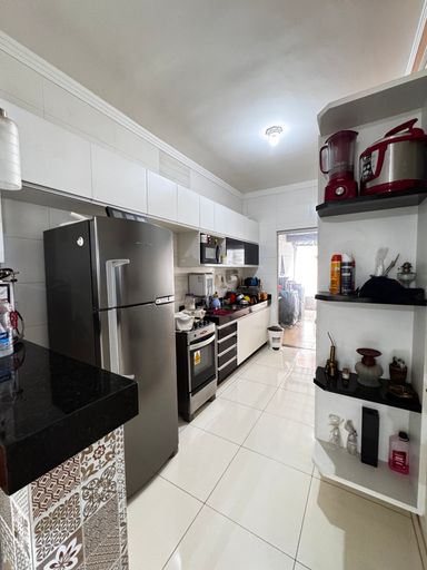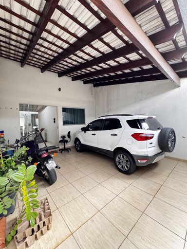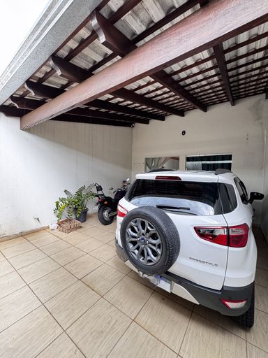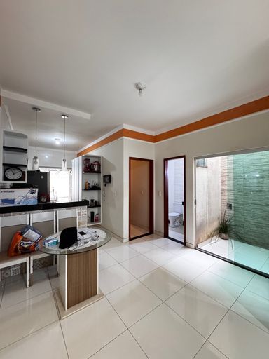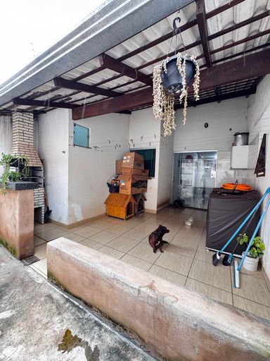 Casa com sala em dois ambientes, dois quartos sendo um suíte, com armários planejados, banheiro social, ambos os banheiros com armários, e box, clara boia, cozinha estilo americana com armários planejados, lavanderia coberta, varanda com churrasqueira, um quintal nos fundos, garagem coberta para dois veículos.