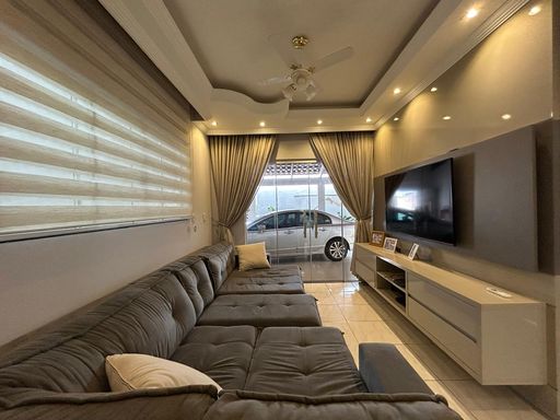Linda casa sendo sala com pé direito duplo, cozinha moderna com ilha integralizada com a sala, banheiro social, três quartos sendo duas suítes, todos os banheiros com cubas e nichos esculpidos, teto com rebaixo em gesso, iluminação em led, garagem para quatro veículos, varanda gourmet com churrasqueira e piscina e um amplo quintal nos fundos.