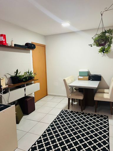 Apartamento sendo sala com sacada, cozinha estilo americana com armários planejados, banheiro social com box e armário planejado, e dois quartos. Contem área de laser com churrasqueira, salão de festa, quadra poliesportiva, e playground.